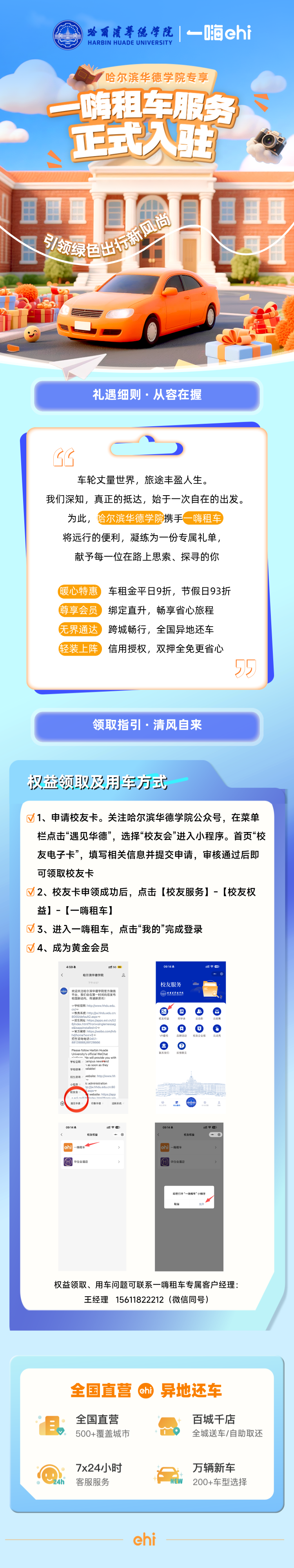 五一假期将至,哈尔滨华德学院校友会正式携手一嗨租车,为你准备了一份专属出行福利: